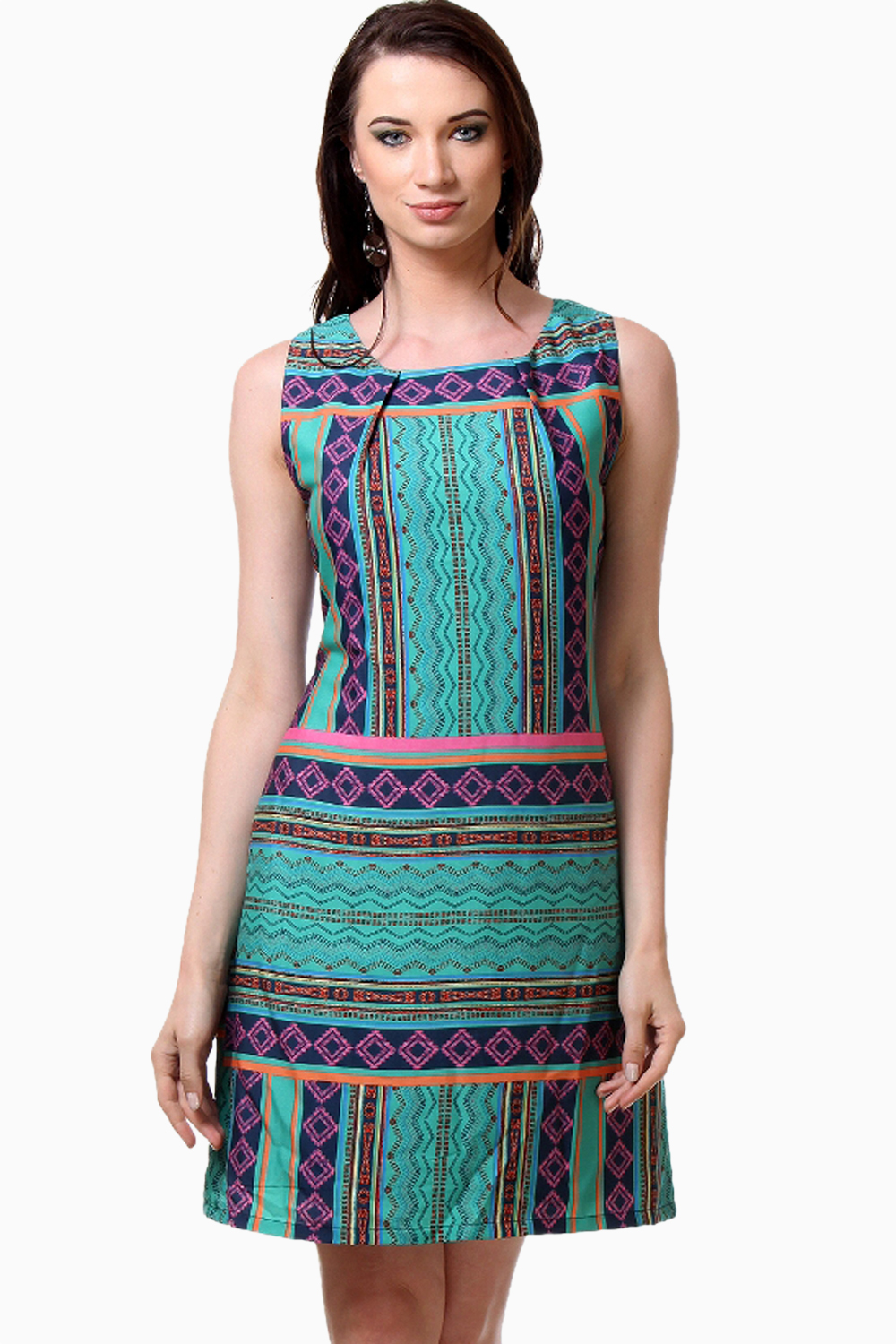 Envy Me Teal Poly Crepe Modified Stripe Printed Dress
