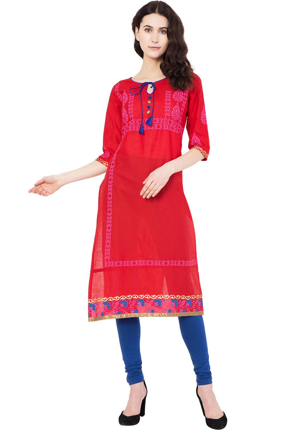 G K DESIGN Red Cotton Dori Work Straight Kurta
